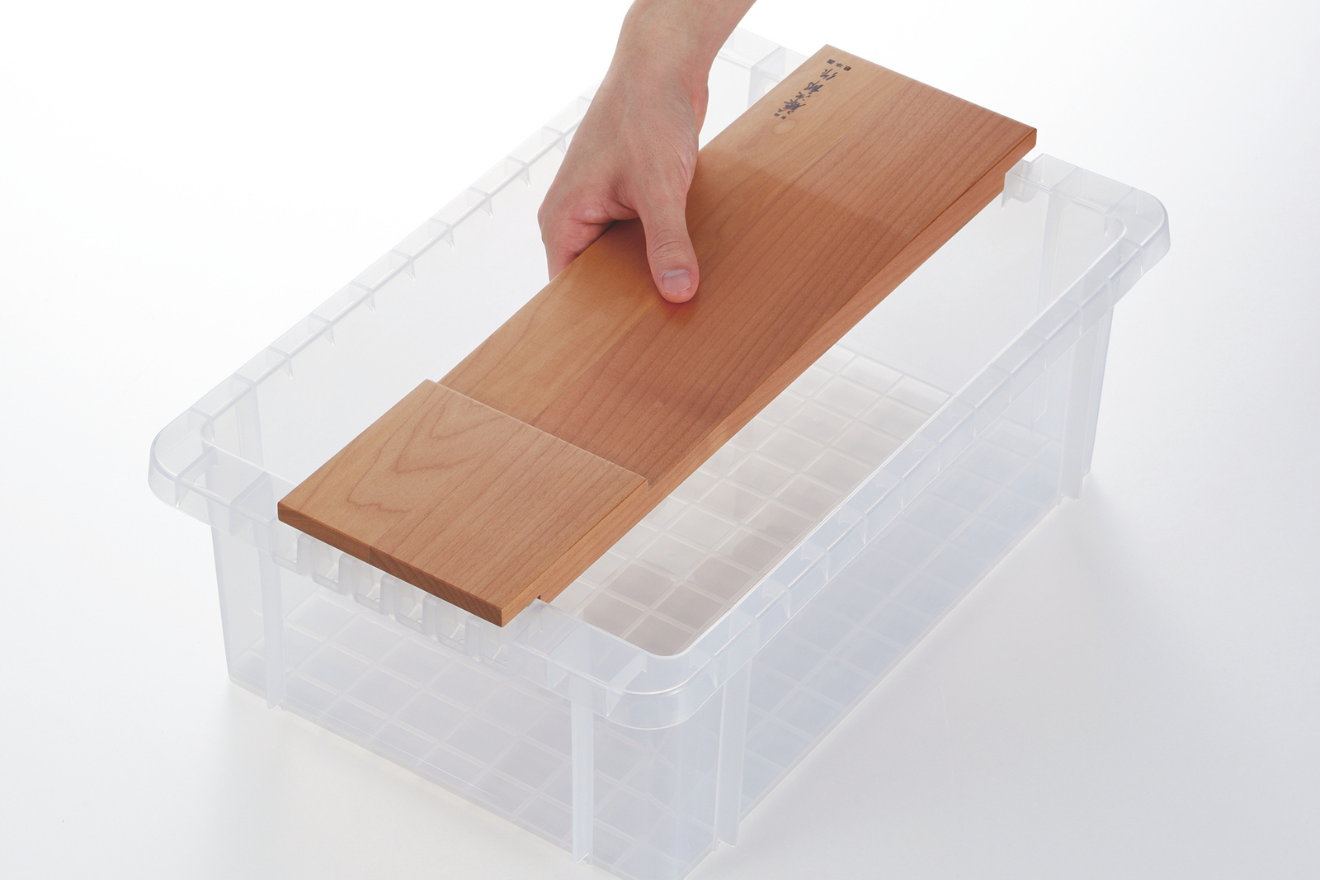 コンテナが水受けになるので、周囲が汚れません。屋内でも屋外でも、自由に持ち出して研ぐことができます。砥石固定台には耐衝撃性・耐摩耗性に優れたメープル材を使用。コンテナにピッタリ合うように設計されています。使い終わった後はコンテナを収納ボックスにして、道具をまとめて保管しておくことができます。