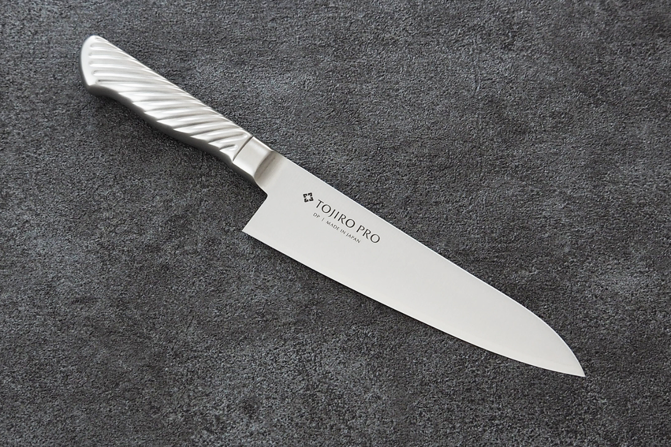芯材にV金10号(VG10)を使用し、側材に13クロームステンレス鋼を複合することにより、業務用の切れ味とお手入れの手軽さを両立。トルネード模様が施されたハンドルは水や油の付いた手でも滑りにくく、快適な調理をサポートします。丸洗いできる衛生的なオールステンレス製です。
