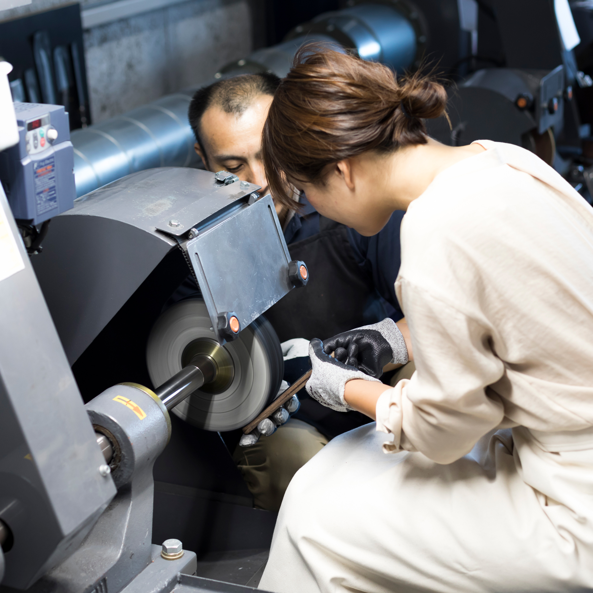 職人が普段働いている作業場に入って刀身研磨や柄のネジ留め、包装まで体験できます。
