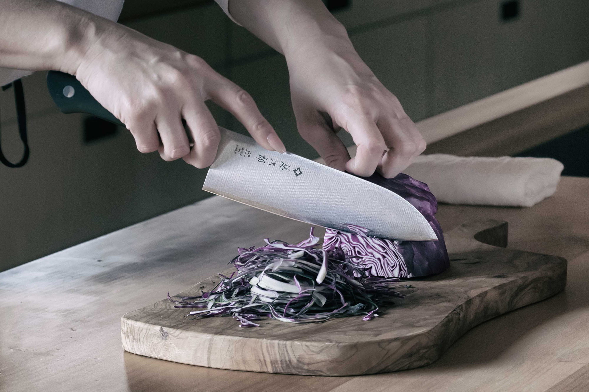 芯材にV金10号(VG10)を使用し、側材に13クロームステンレス鋼を複合することにより、業務用の切れ味とお手入れの手軽さを両立。ハンドルにはアウトドアナイフなどに使用される積層強化材を採用。経年変化に強く、ハンドルがやせにくく、長期間の使用に抜群の耐久性を誇ります。刀身とハンドルの接合部には、汚れが溜まりにくく衛生的で丈夫な口金付です。(1996年度グッドデザイン・ロングライフデザイン賞受賞)