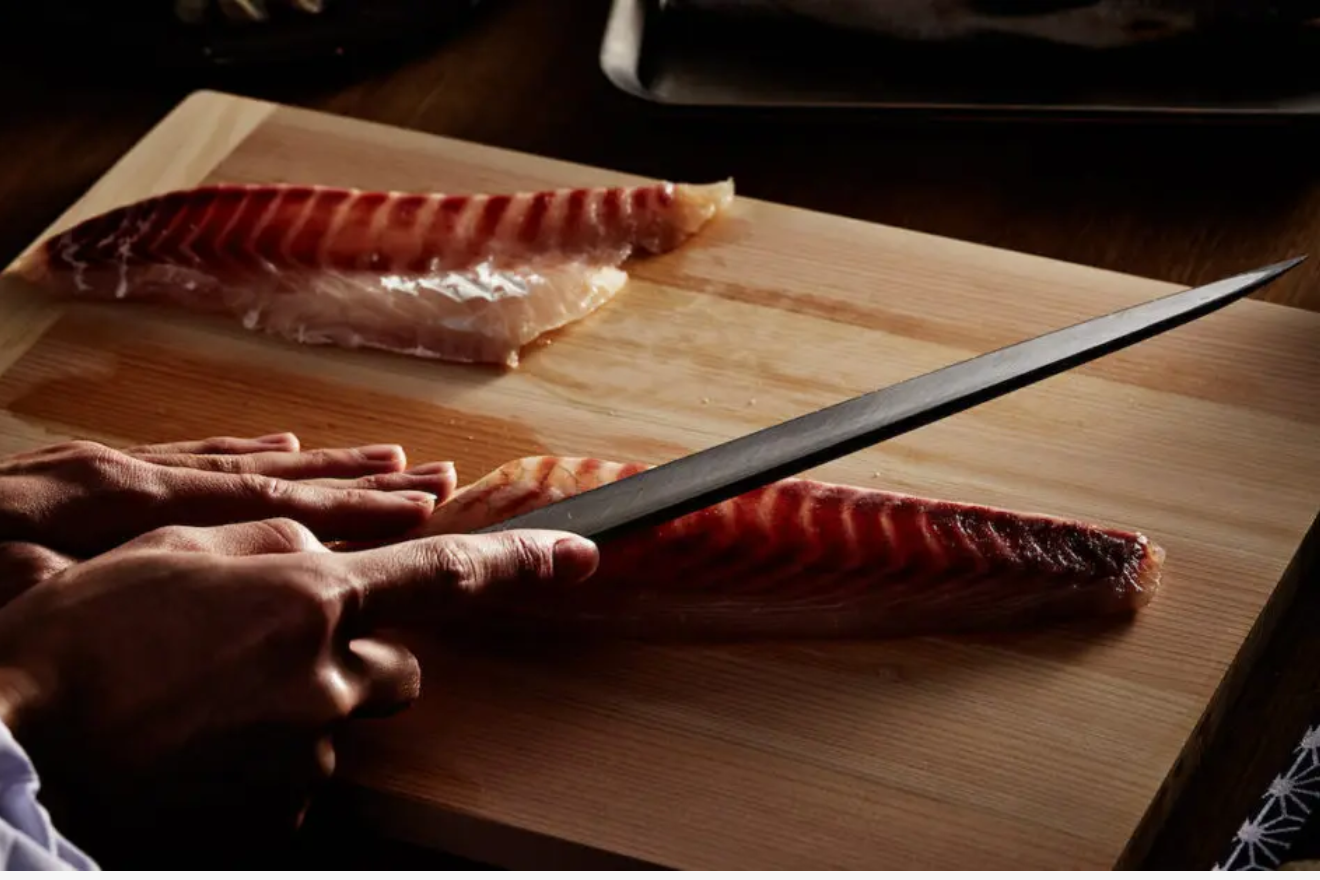 柳刃は刺身を引くための包丁です。刃元(あご)から切っ先まで引き切るように使います。