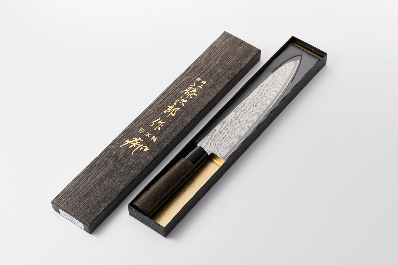 硬度の異なる2種類のステンレス鋼を何層にも重ね合わせることでうまれる優美なダマスカス模様。芯材のV金10号(VG10)の均一性が高まり鋭い切れ味を発揮します。また、医療用器具などに採用される技術で黒色酸化被膜を施しており、耐蝕性に優れる美しい発色仕上げです。ハンドルには耐久性の高い栗の木を用いており、表面に焼き加工を施すことでさらに腐蝕に強く仕上げています。