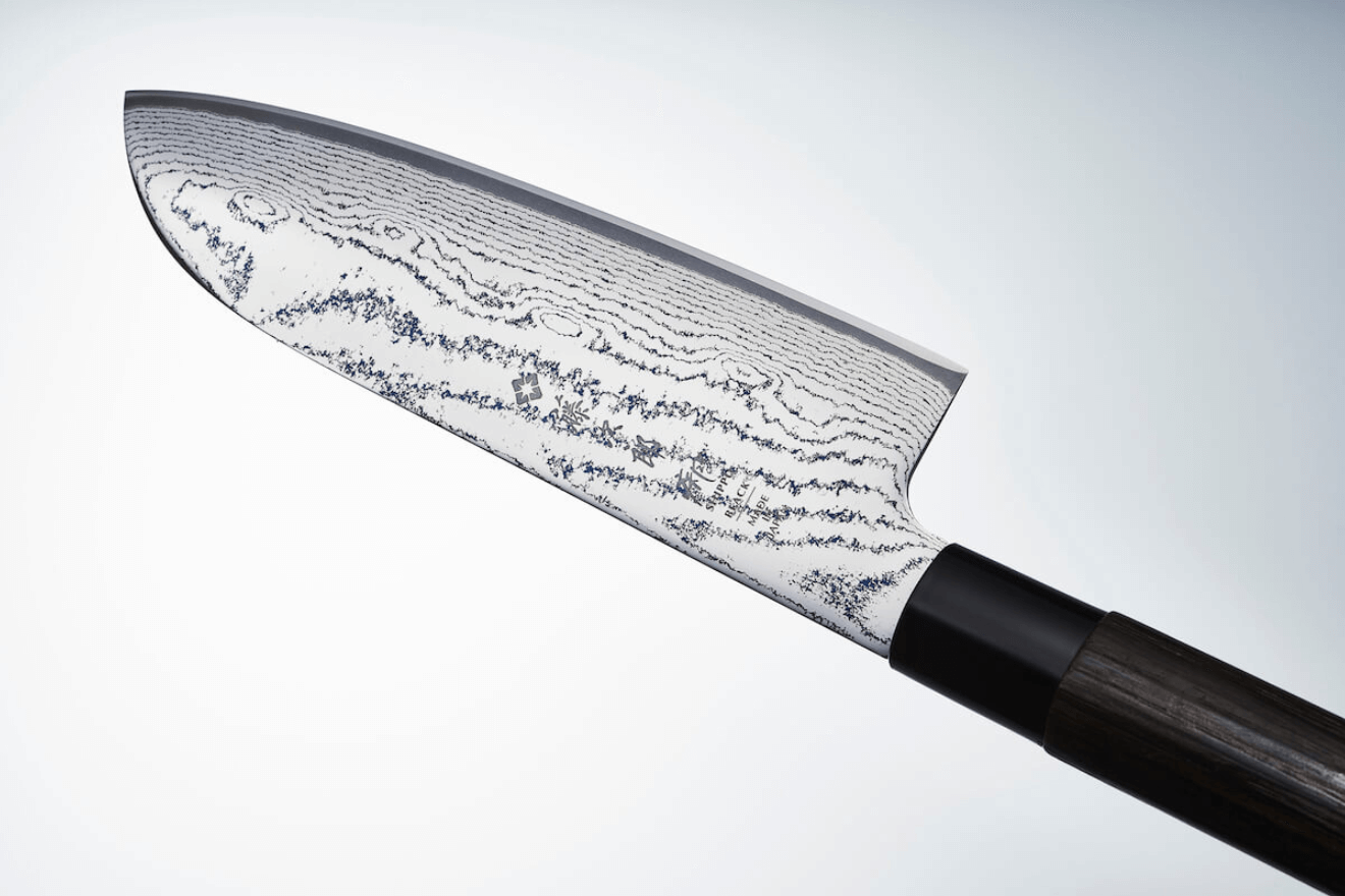 硬度の異なる2種類のステンレス鋼を何層にも重ね合わせることでうまれる優美なダマスカス模様。芯材のV金10号(VG10)の均一性が高まり鋭い切れ味を発揮します。また、医療用器具などに採用される技術で黒色酸化被膜を施しており、耐蝕性に優れる美しい発色仕上げです。ハンドルには耐久性の高い栗の木を用いており、表面に焼き加工を施すことでさらに腐蝕に強く仕上げています。