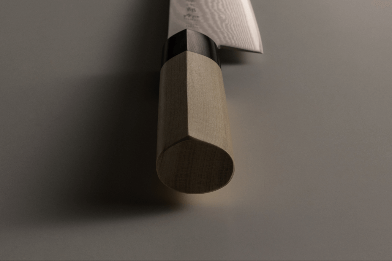 硬度の異なる2種類のステンレス鋼を何層にも重ね合わせることでうまれる優美なダマスカス模様。芯材のV金10号(VG10)の均一性が高まり鋭い切れ味を発揮します。ハンドルには耐水性に優れ手触りの優しい朴木を採用。伸縮性のある本水牛桂が刀身のガタつき・抜けを防ぎます。