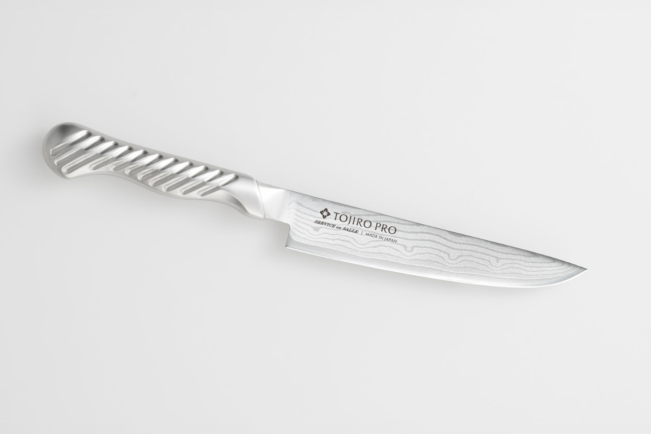 フランス料理文化センター監修のもと開発されたサーヴィス専用ナイフです。硬度の異なる2種類のステンレス鋼を何層にも重ね合わせることでうまれる優美なダマスカス模様。芯材のV金10号(VG10)の均一性が高まり鋭い切れ味を発揮します。サーヴィス独特の握り方に対応した特殊形状ハンドルが最高のパフォーマンスをサポートします。さらに、トルネード模様を施すことにより水や油の付いた手でも滑りにくく、快適に調理することができます。