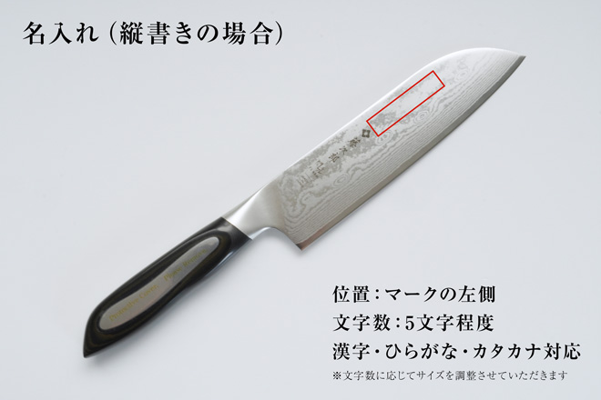 名入れ方法は「レーザー」と「彫刻」からお選びいただけます。お名前以外にもメッセージやマークを入れることも可能です。世界に一丁だけのオリジナル包丁として、贈り物にも大変喜ばれます。