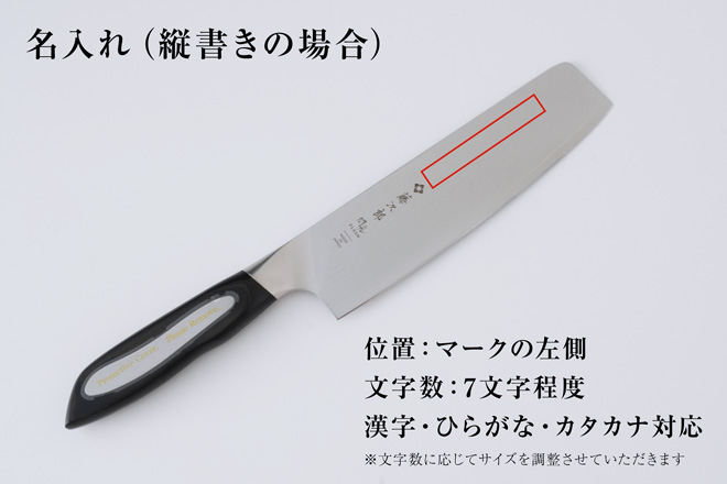 名入れ方法は「レーザー」と「彫刻」からお選びいただけます。お名前以外にもメッセージやマークを入れることも可能です。世界に一丁だけのオリジナル包丁として、贈り物にも大変喜ばれます。