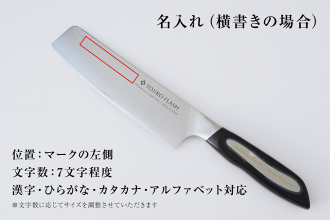 包丁の刀身には、両面にロゴが入ります。片面には「閃光」、もう片面には「FLASH」のロゴが、それぞれ刻印されていますので、お名入れをご希望の際は、画像2枚目と3枚目をご確認ください。